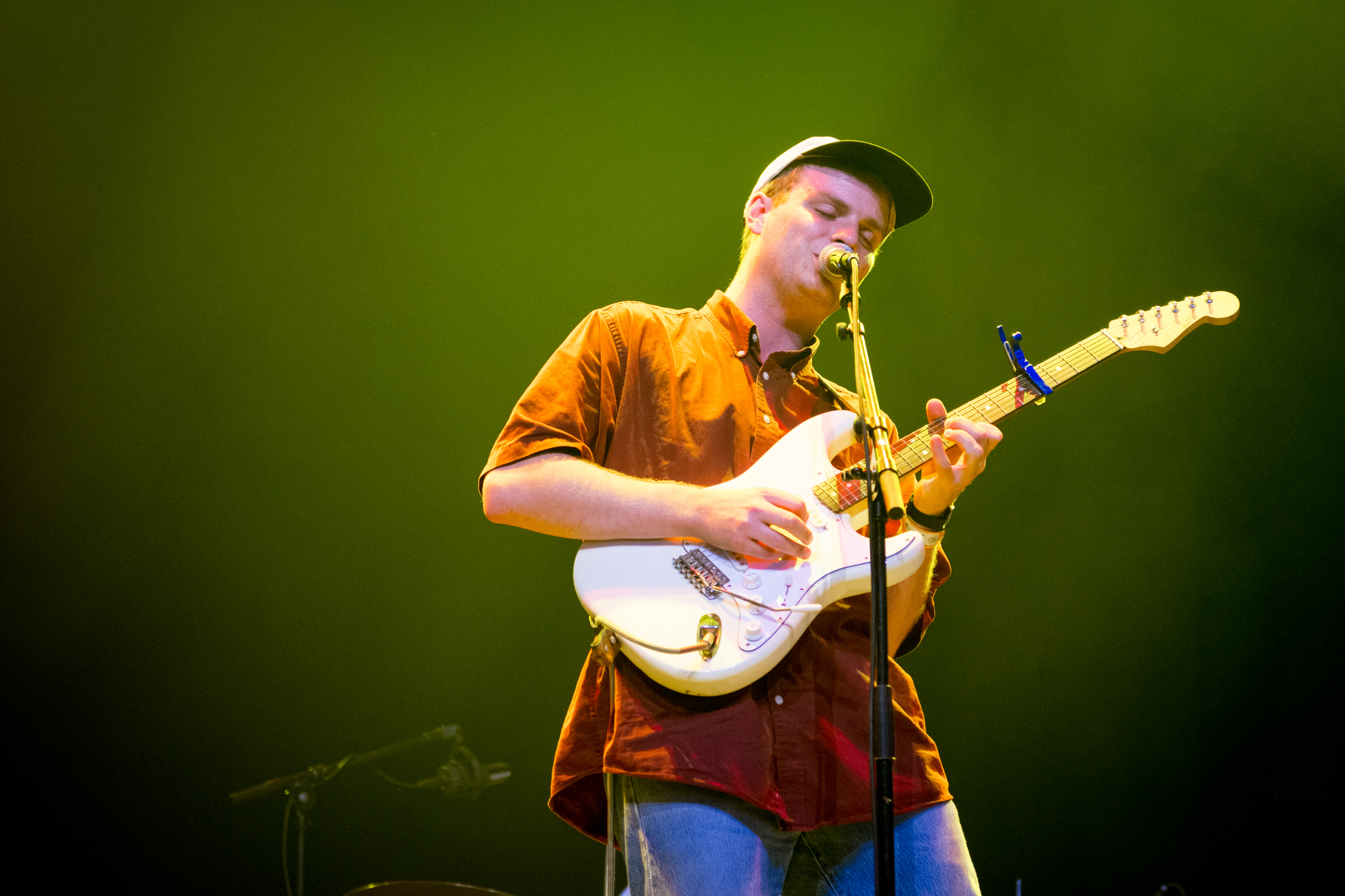 Bathed in the soft purple and pink hues of the stage lights, the young crowd – all dungaree and dad-cap clad – hums with a palpable sense of anticipation. Mac’s band emerge onto stage one-by-one, each of them introduced by a pitched-down voiceover that overlays a gooey instrumental. The room is catapulted into a frenzied uproar with the side-splitting entrance (‘25% Italian and riddled with disease’) of the ‘man of the hour’. Cradling three cans of Stella and revealing a further two from the back pockets of his jeans, Mac lumbers into view, lining the drinks neatly atop one of the amps. The opening synth-line of On the Level is barely heard against the clamour of the crowd, who are propelled into a singular, swaying mass as Mac and his band segue into the jangly guitar-tones of Salad Days.